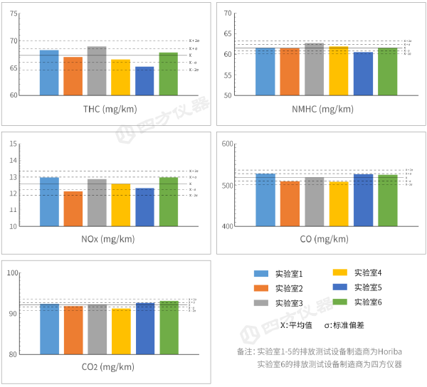 2024年由某國(guó)家級(jí)摩托車排放質(zhì)檢中心聯(lián)合5個(gè)大型摩托車企業(yè)開展了6個(gè)摩托車排放實(shí)驗(yàn)室間的比對(duì)試驗(yàn)。其中,5個(gè)排放實(shí)驗(yàn)室均使用了國(guó)際知名制造商Horiba公司生產(chǎn)的全流稀釋排放測(cè)試系統(tǒng),另外1個(gè)排放試驗(yàn)室使用了四方儀器生產(chǎn)的全流稀釋排放測(cè)試系統(tǒng)。本次比對(duì)試驗(yàn)使用了同一輛2-1類兩輪摩托車樣車。各實(shí)驗(yàn)室嚴(yán)格按照(EU)No 134/2014(歐五)標(biāo)準(zhǔn)要求完成常溫下冷啟動(dòng)后排氣污染物排放試驗(yàn)(I型試驗(yàn))。比對(duì)試驗(yàn)結(jié)果顯示所有參比實(shí)驗(yàn)室各污染物組分的平均值在標(biāo)準(zhǔn)偏差的±2σ以內(nèi)(圖2),表明各實(shí)驗(yàn)室試驗(yàn)結(jié)果的一致性較好。同時(shí),本次比對(duì)試驗(yàn)結(jié)果及結(jié)論充分表明:四方儀器全流稀釋排放測(cè)試系統(tǒng)(CVS)不僅完全符合摩托車歐五及國(guó)五標(biāo)準(zhǔn)技術(shù)要求,其實(shí)際性能水平也已經(jīng)與國(guó)際主流品牌產(chǎn)品相當(dāng)。