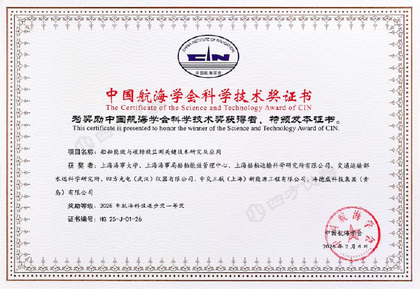 2025 年度中國(guó)航海學(xué)會(huì)科學(xué)技術(shù)進(jìn)步獎(jiǎng)評(píng)選結(jié)果公布,四方儀器攜手上海海事大學(xué)、上海海事局、交通運(yùn)輸部等多家單位聯(lián)合研發(fā)的船舶能效與碳排放監(jiān)測(cè)關(guān)鍵技術(shù)研究及應(yīng)用成果,榮獲航海科技進(jìn)步獎(jiǎng)一等獎(jiǎng)!