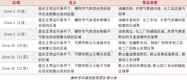 國際標(biāo)準(zhǔn)將危險區(qū)域劃分為氣體環(huán)境(Zone 0/1/2)與粉塵環(huán)境(Zone 20/21/22),不同區(qū)域?qū)υO(shè)備的防爆等級要求截然不同。例如:Zone 1(氣體易燃環(huán)境)需采用隔爆型(Ex d)設(shè)計,而Zone 21(粉塵易爆環(huán)境)則要求設(shè)備具備粉塵防爆(Ex tb)認(rèn)證。
