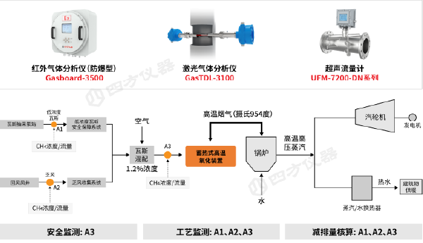 四方儀器憑借先進的氣體傳感器技術(shù)和工業(yè)監(jiān)測設(shè)備開發(fā)經(jīng)驗,為煤礦乏風(fēng)綜合利用領(lǐng)域量身定制了一套氣體監(jiān)測綜合解決方案。該方案集成可調(diào)諧半導(dǎo)體激光(TDLAS)、超聲波等多種氣體傳感技術(shù),實時在線監(jiān)測泵站出口、輸送系統(tǒng)、摻混器前后端等關(guān)鍵點位的濃度與流量,有效保障安全生產(chǎn)、優(yōu)化瓦斯抽采輸送利用方案,并為后期甲烷減排量核算提供精準數(shù)據(jù)支撐。