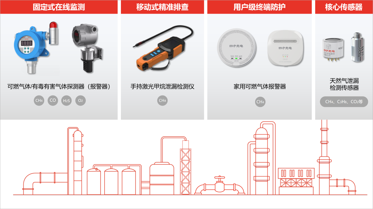 本方案依托我司自主研發(fā)的紅外與激光傳感器技術,向下游延伸出覆蓋工業(yè)、巡檢、家用三大場景的氣體監(jiān)測產(chǎn)品矩陣,形成從“感知核心”到“終端預警”的完整鏈條。